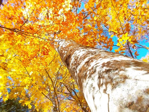 - 秋晴れの青く高い空を背景に、山は深い緑の木々の中に黄金色の木が混じりパッチワークのようになります
